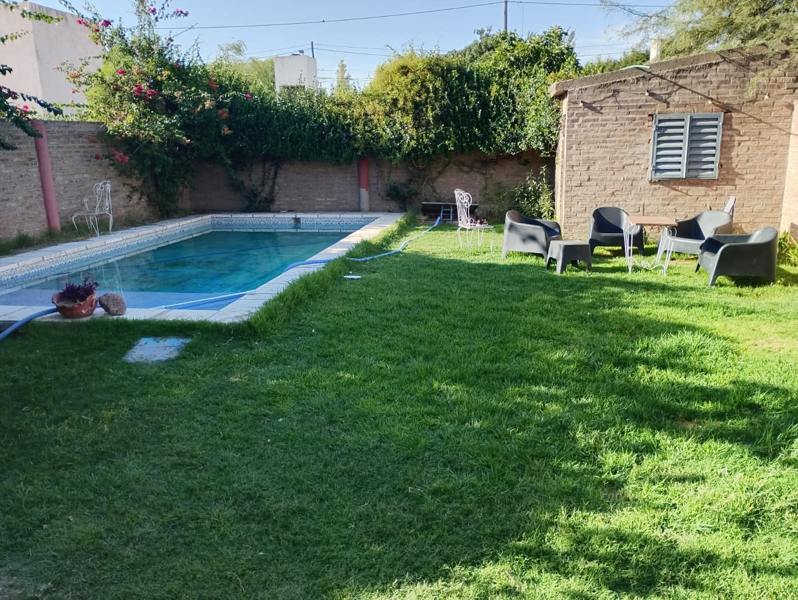 En el exterior, la casa cuenta con un jardín, patio con piscina amplia Además, dispone de Garaje para dos vehículos. El terreno tiene un frente de 12 m y un largo de 31 m. La propiedad tiene 2 plantas y una antigüedad de 13 años. Orientación NO.